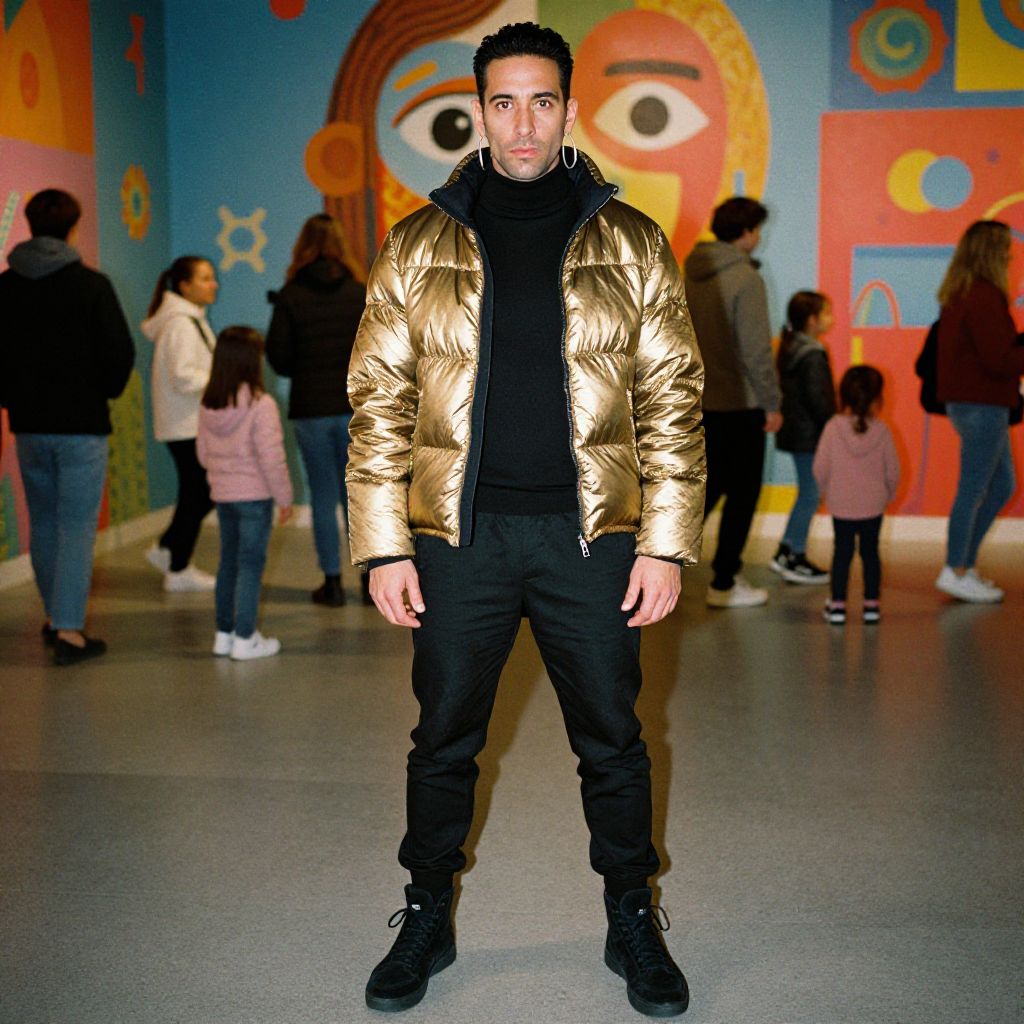A man, metallic gold puffer jacket, tapered black joggers, black turtleneck, high-top black suede sneakers, oversized silver hoop earrings, vibrant murals, interactive exhibits, bustling families, kodachrome analog film, confident expression Man has masculine face and piercing eyes