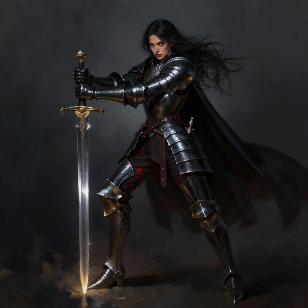 Digital art of a silver-haired, elven warrior in shining black armor, holding a sword, under a full moon in a ruined, dark landscape.