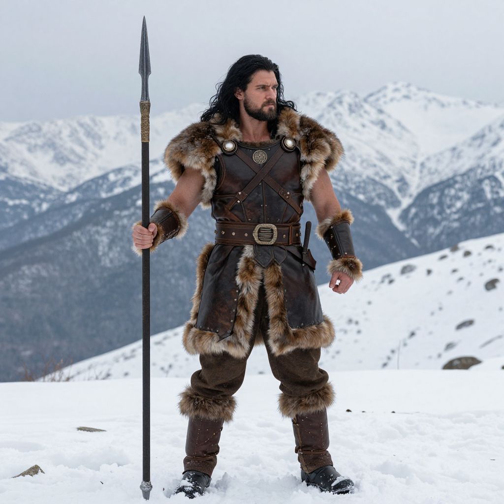 Photograph of a muscular, bearded man with long black hair standing in a snowy mountain landscape. He's wearing fur-trimmed, leather armor with a belt and shoulder guards, and brown pants. He's holding a spear in his right hand, looking determined. The snow-covered mountains in the background contrast with his dark, rugged attire. The overall vibe is epic and warrior-like.