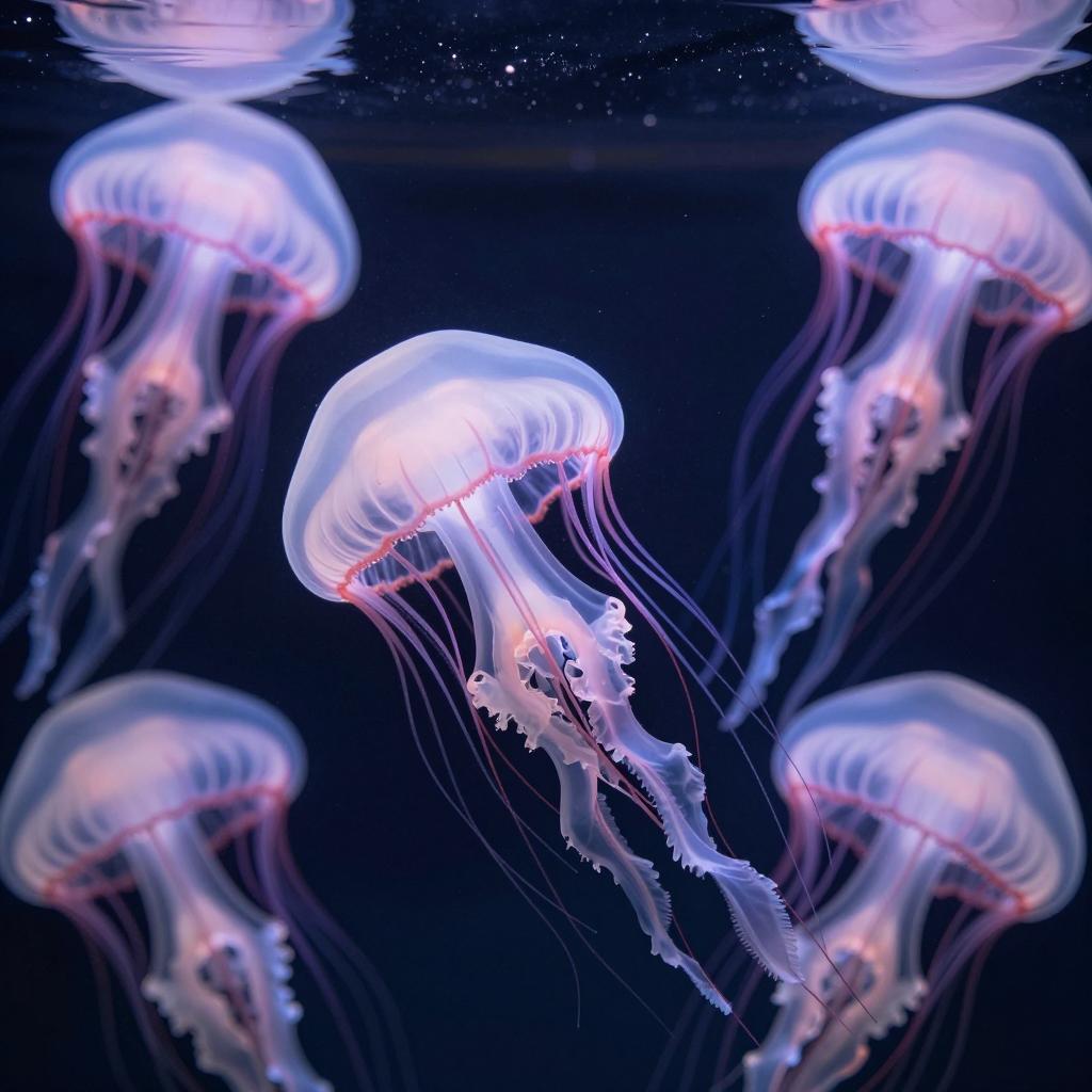 Reflection a group of purple jellyfish swimming along in water, in the style of dark pink and white, striated resin veins, meticulous details, naturalist aesthetic, ethereal subjects, ethereal subjects, ethereal subjects,