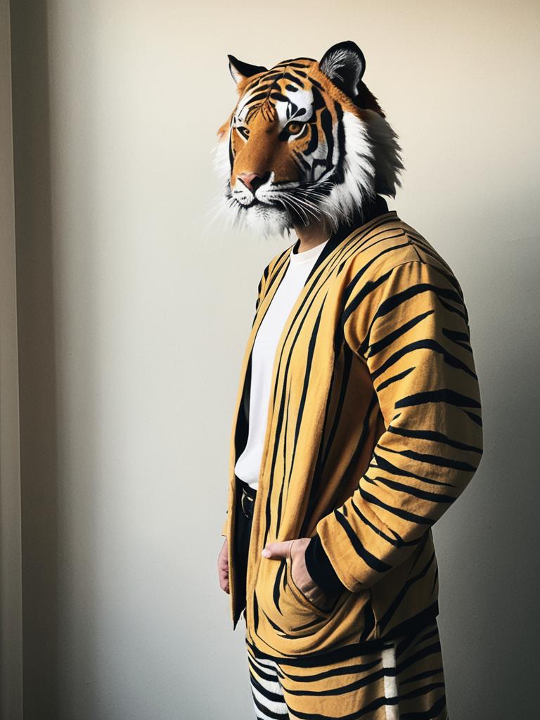 Man cosplay. Wearing Yawara Chatora (Tiger) costume. Realistic photo. Dressed as Yawara Chatora (Tiger) --sref 1400