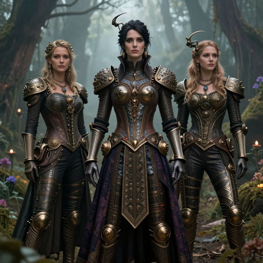 This CGI image depicts three women standing in a misty, enchanted forest. They are dressed in elaborate, dark medieval armor with intricate gold and black designs, featuring ornate chest plates and shoulder guards. The central woman has dark hair with a black, horn-like accessory, and a stern expression. The two women on either side have blonde hair and similar armor, with the one on the right having a small, curved horn on her helmet. The background is filled with tall trees, soft mist, and glowing fairy lights, adding a magical atmosphere. The armor has a textured, metallic look, while the forest floor is covered with moss and small flowers.