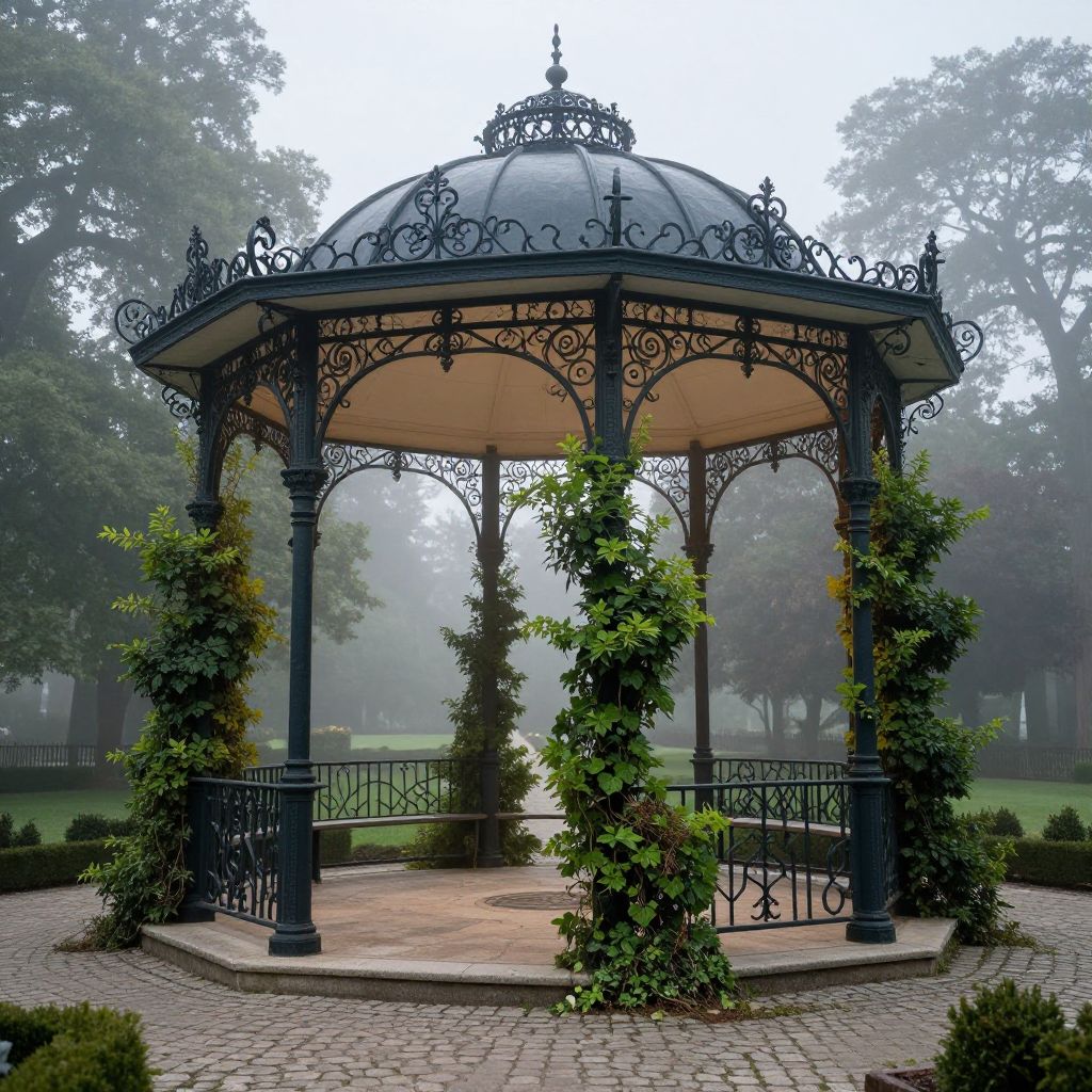Gazebos made of wrought iron in a Victorian era park, detailed ornate patterns, lush green ivy climbing the pillars, early morning mist creating a magical ambiance, cobblestone pathways leading up to the structure, atmospheric lighting emphasizing elegance and charm.