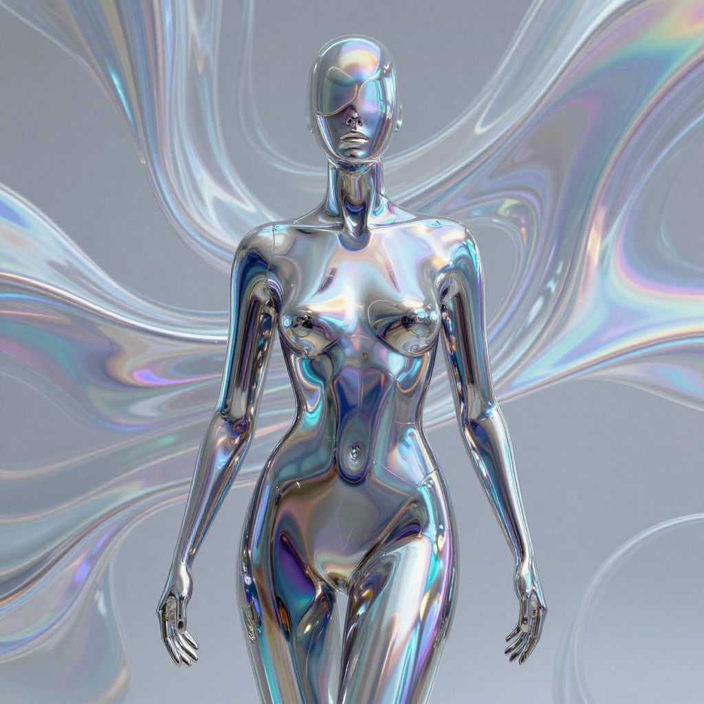 Asset Creation a shapely woman made of shiny iridescent metallic liquid, photorealistic, holographic, abstract art,