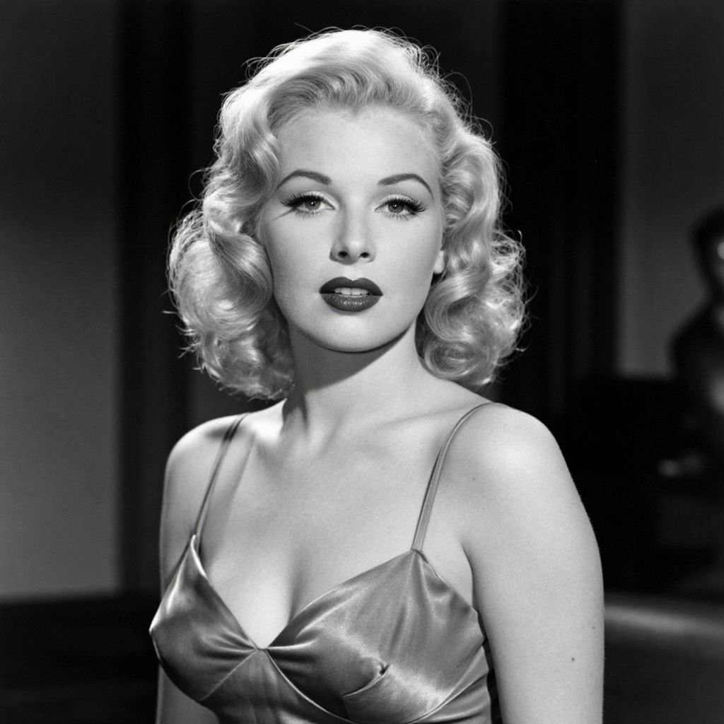 This black-and-white photograph captures a classic pin-up style portrait of a woman with vintage 1950s glamour. She has wavy, shoulder-length blonde hair and wears dark lipstick. Her expression is confident and alluring. She is dressed in a shiny, satin camisole with thin straps, revealing her shoulders and upper chest. The background is blurred, emphasizing her as the main subject. The lighting creates a dramatic contrast, highlighting the texture of her hair and the sheen of her dress. The overall style evokes the iconic looks of Hollywood starlets from the mid-20th century.