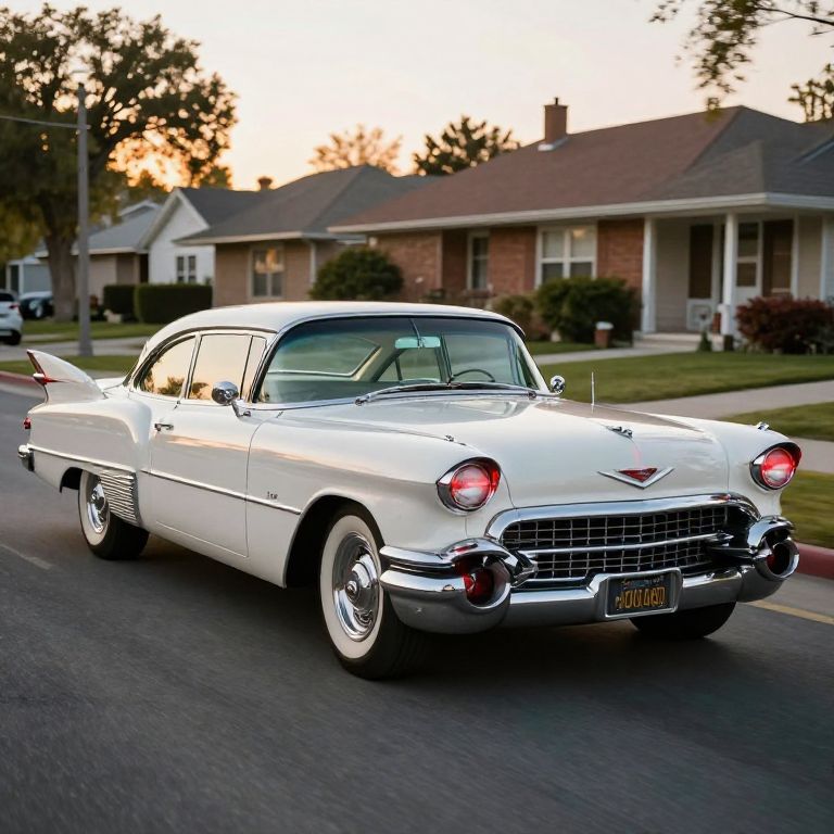 Vintage 1959 Cadillac Miller Meteor Sentinel in pristine condition, gleaming white body with red emergency lights, driving through a mid-century American suburban neighborhood during golden hour, detailed reflections, nostalgic and atmospheric style
