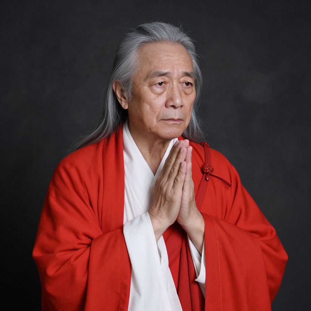 Photograph of an elderly Asian man with long, gray hair, wearing a vibrant red robe over a white shirt. His hands are pressed together in a prayer position, with a calm and contemplative expression on his face. The background is a solid, dark blue, making the red of his robe stand out prominently. The texture of his robe is slightly rough, and the white shirt is smooth. A small red brooch is pinned on the left side of his chest. The lighting is soft, highlighting his serene demeanor and the rich colors of his clothing.