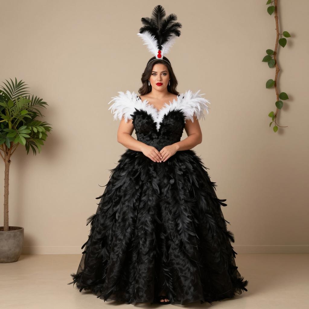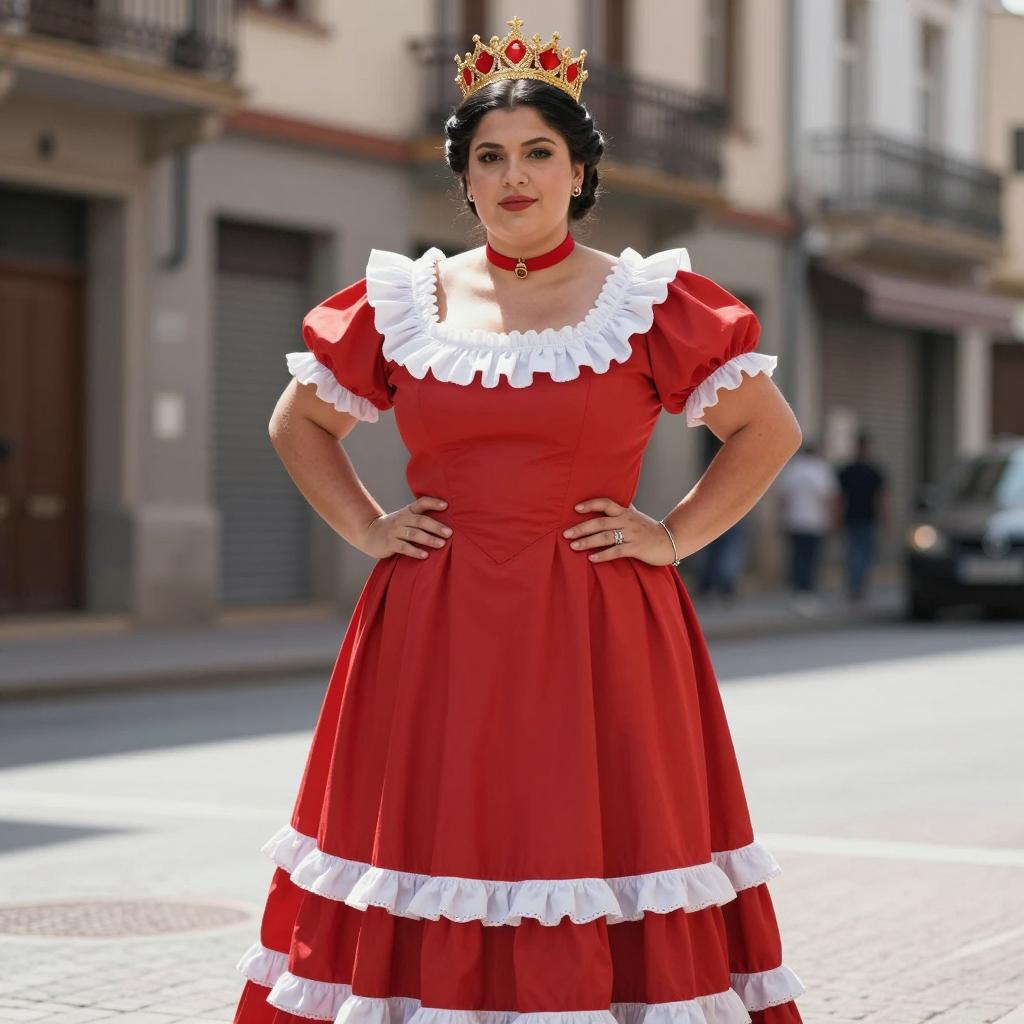 Red queen costume plus size, photorealistic, woman, standing, outdoor, daytime, full body, traditional Spanish costume, red dress, ruffled white trim, square neckline, white collar, red choker, red crown with gold accents, black hair in braided bun, light skin, confident expression, silver bracelet, blurred background, urban setting, bright sunlight, realistic colors, detailed ures, medium shot