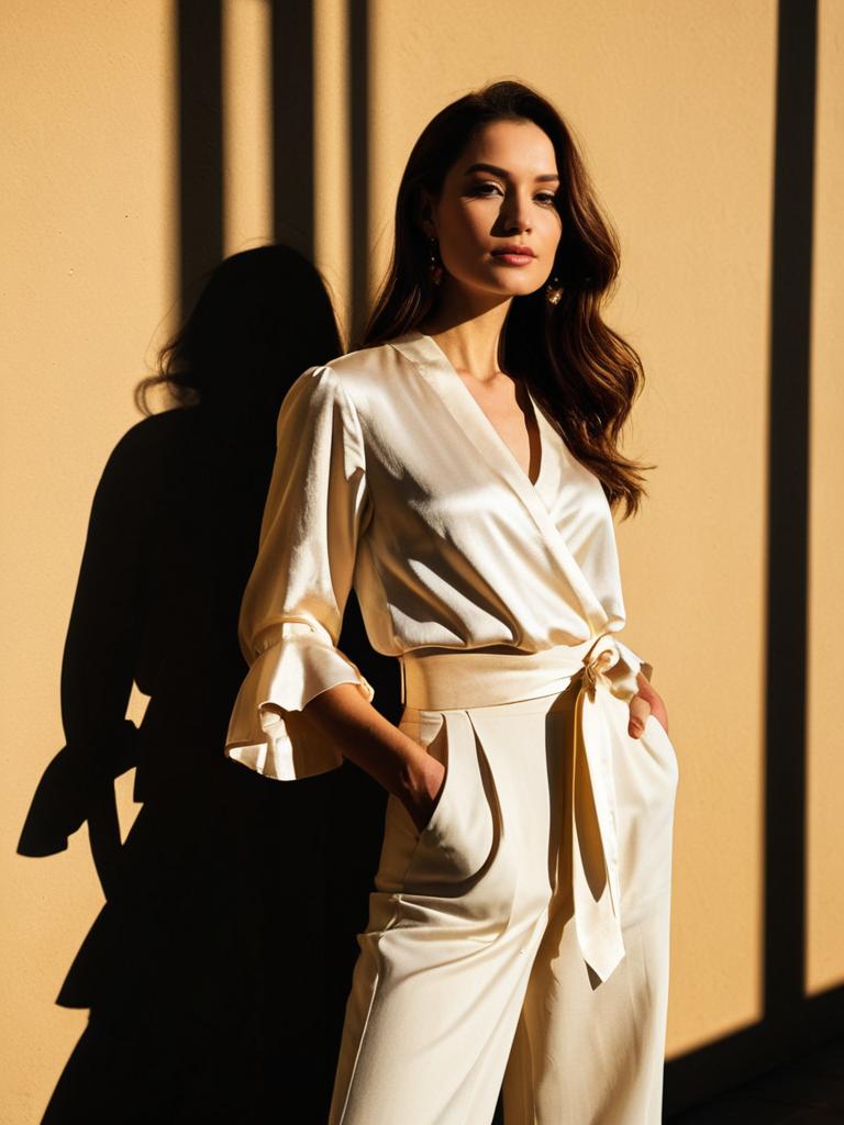 Portrait of a stylish woman with medium skin tone and wavy brown hair, wearing a cream satin finish wrap blouse with three-quarter mandarin cuff sleeves and scoop neckline, paired with high-waist beige wide-leg trousers with a fabric belt. She stands confidently with hands in pockets against a warm-toned studio background with dramatic lighting and shadows.