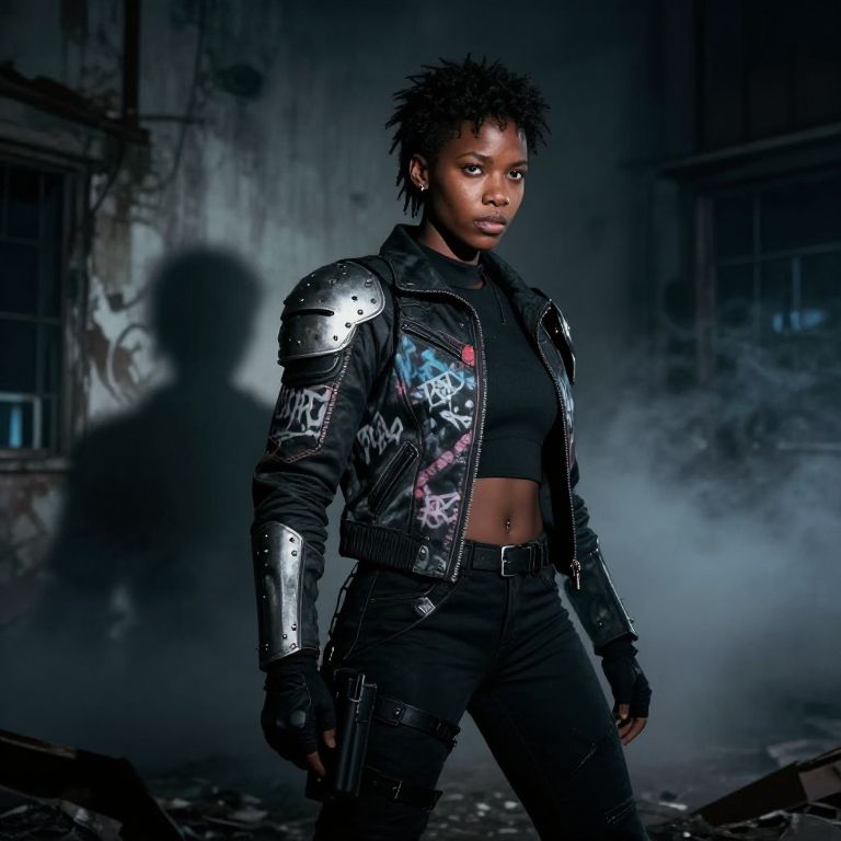 Photograph of a young Black woman with short, spiky hair standing in a dimly lit, abandoned building with grungy walls and broken windows. She wears a black leather jacket with metallic shoulder pads, colorful abstract designs, and black pants. Her midriff is exposed, showing a navel piercing. She has a serious expression, and the lighting casts a dramatic shadow on the wall behind her. Fog or smoke adds a moody atmosphere to the scene. The overall style is edgy and urban, with a cyber-punk aesthetic.