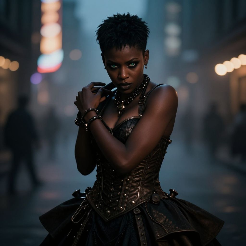 Photograph of a confident Black woman with short, spiky hair, wearing a black leather jacket with metallic armor patches, black crop top, and jeans
