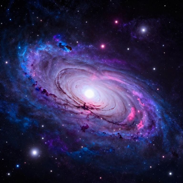 Photograph of a vibrant spiral galaxy with a bright white core, surrounded by purple, blue, and pink nebulae, set in a star-filled