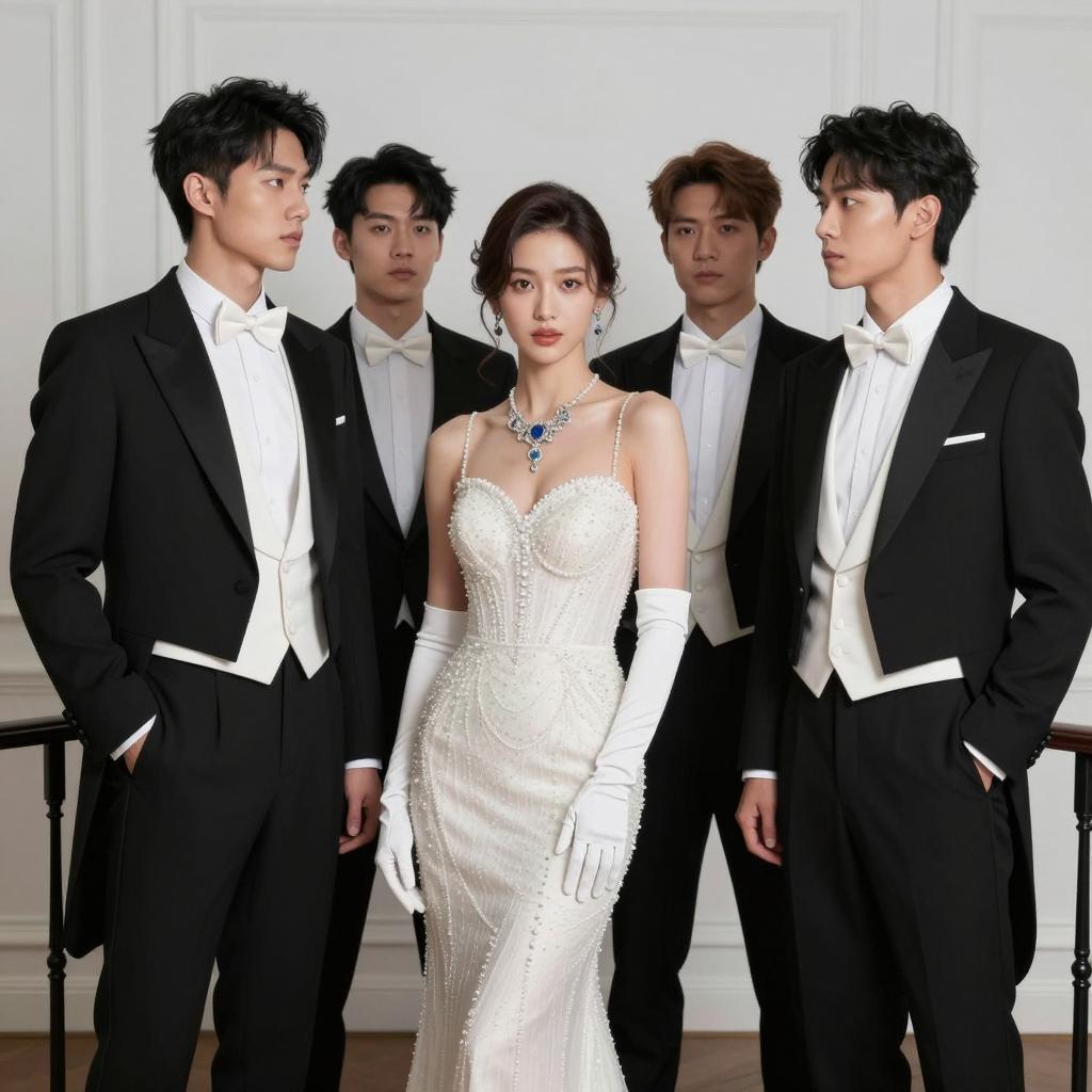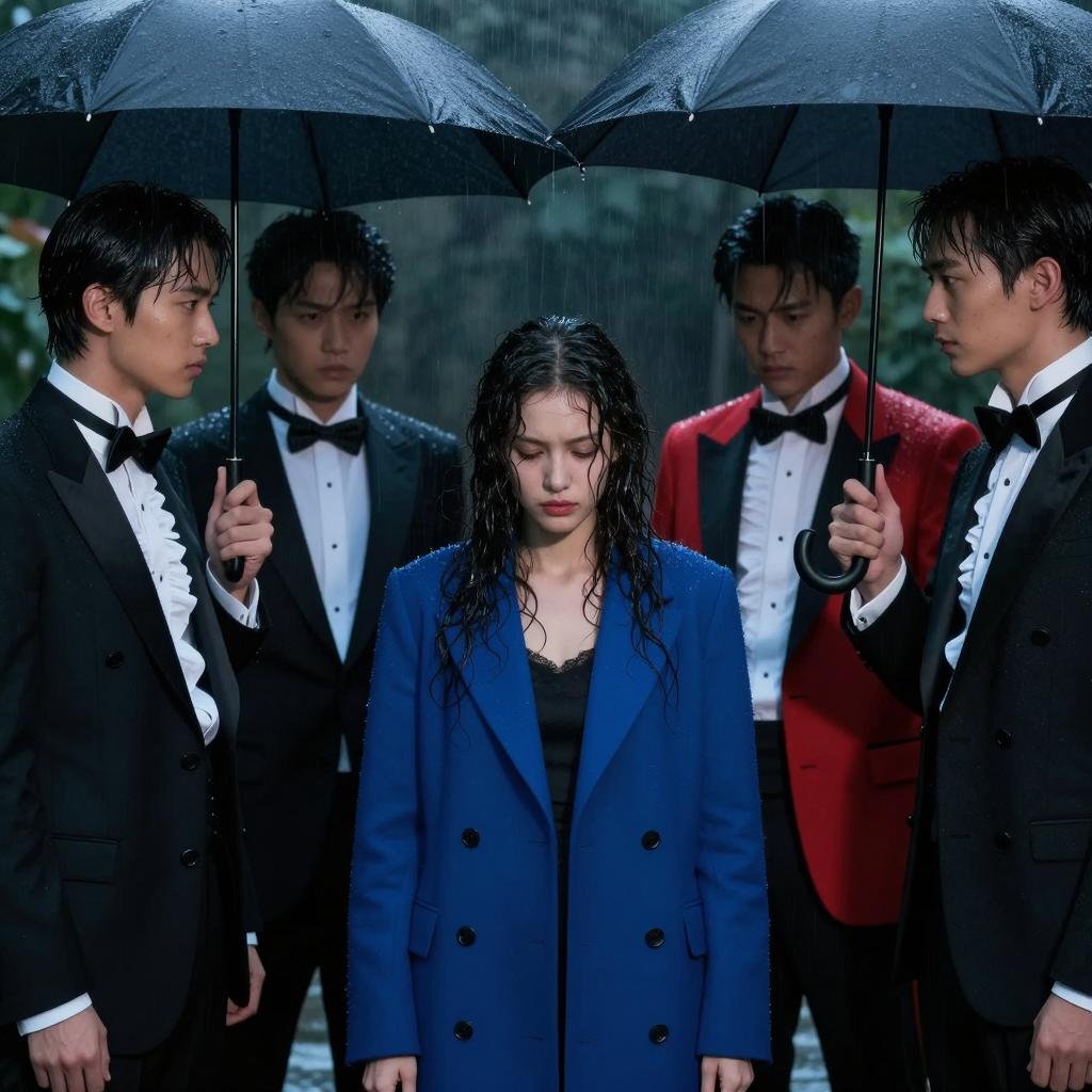 Five people in a rainy night scene. Four men in formal attire—black tuxedo, white shirt with ruffles, red jacket with high collar, black overcoat—stand around a woman with wet, curly hair in a blue coat. Men hold umbrellas, focusing on her. Blue and red lighting highlights their wet clothes. Woman's expression is intense, looking down. Men's faces neutral to serious. Rain visible in the background.