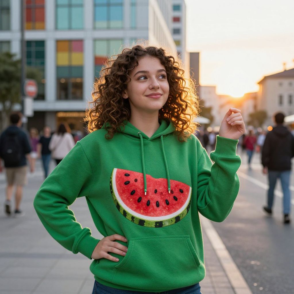 A young woman with curly brown hair and warm, friendly eyes stands on a bustling city street, wearing a vibrant green watermelon hoodie featuring a large, detailed watermelon slice on the front. She has a relaxed, joyful expression, one hand resting on her hip while the other is slightly raised as if pointing toward the sky. The background shows a modern building with colorful windows and a faint sunset casting golden light across the street. The scene is bright and lively, with pedestrians walking by and a subtle hint of summer atmosphere.