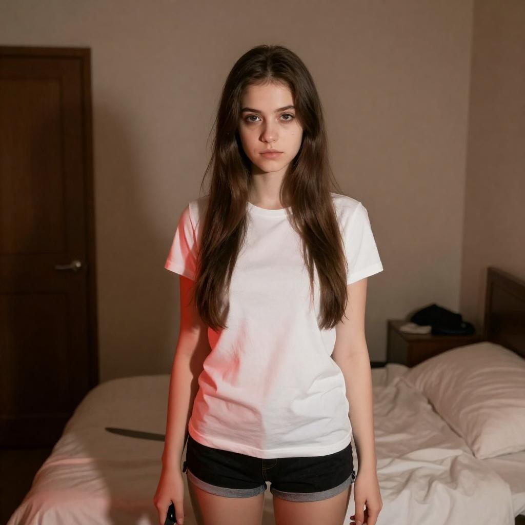 Photograph of a young woman with long, straight brown hair, standing in a dimly lit bedroom. She wears a white t-shirt and black shorts, holding a knife in her right hand. The room has a bed with rumpled sheets, a wooden door on the left, and a bright light source casting red and orange shadows.