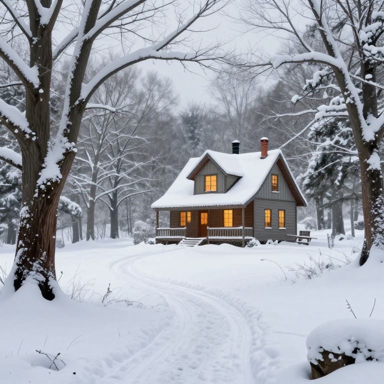 A serene winter landscape rendered in a high-definition digital art style, featuring a quaint cabin with warm, glowing windows nestled amidst snow-covered trees and a winding path, evoking the tranquil charm of \"First Snow at Mabry Mill.\