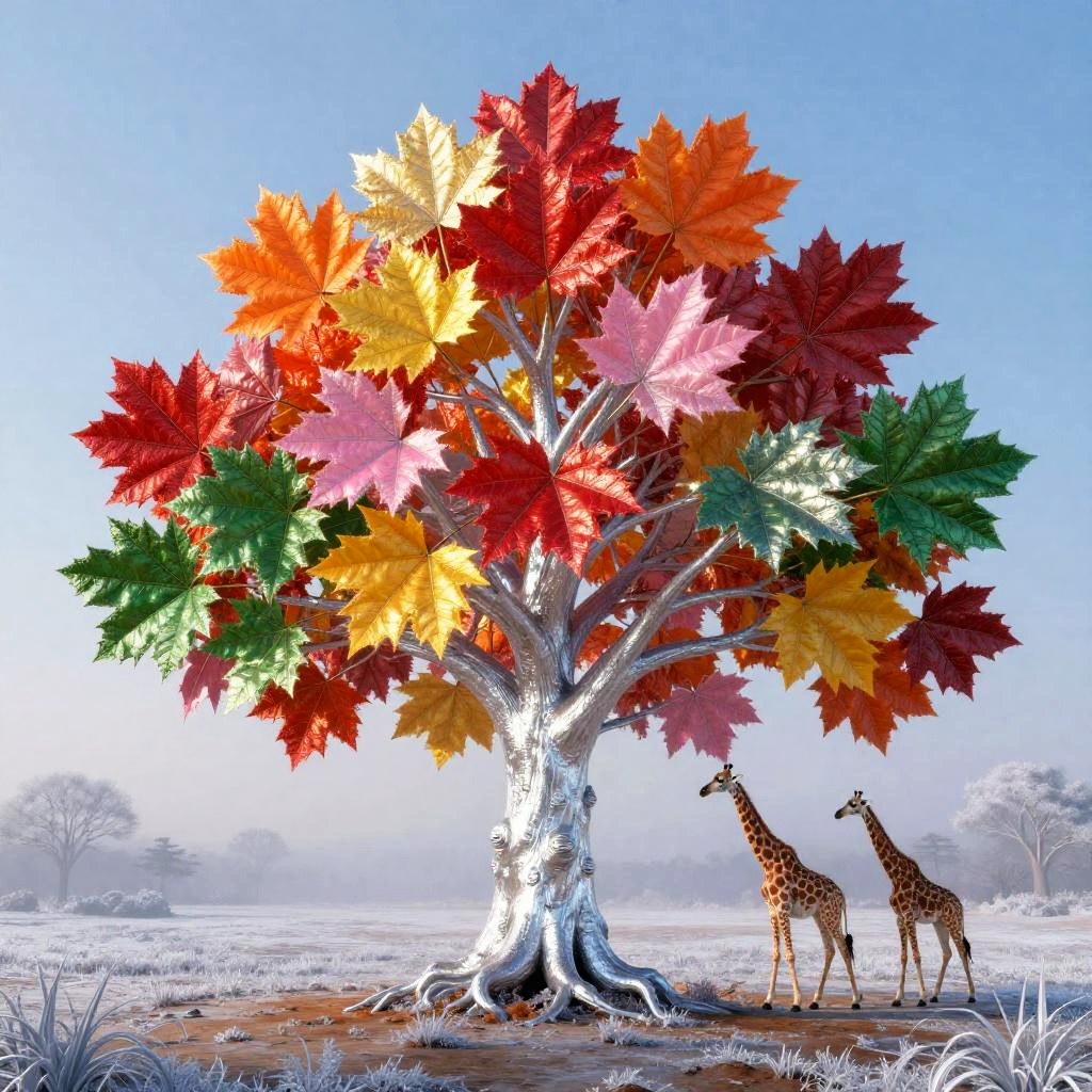 Hyper-realistic vibrant scene featuring a shimmering saguaro cactus with broad 3D branches in red, orange, green, pink, and yellow hues. Light reflects off the cactus top under a purple dusk sky. Two giraffes walk gracefully across a desert landscape marked with sandstone ripple patterns, approaching a beautifully illuminated tree. The scene captures a surreal and mystical desert ambiance.