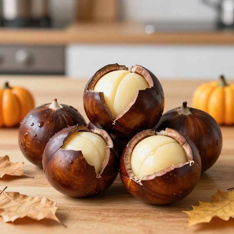 Photograph of four halved chestnuts with creamy, pale yellow interiors, arranged in a pyramid on a wooden surface. The chestnuts have dark brown, glossy skins with slight water droplets. In the blurred background, there are small orange pumpkins and a white kitchen counter. Autumn leaves are scattered around the chestnuts, adding a seasonal touch. The lighting is bright, highlighting the texture and color contrast between the chestnuts and the wooden surface. The image evokes a warm, autumnal feel.