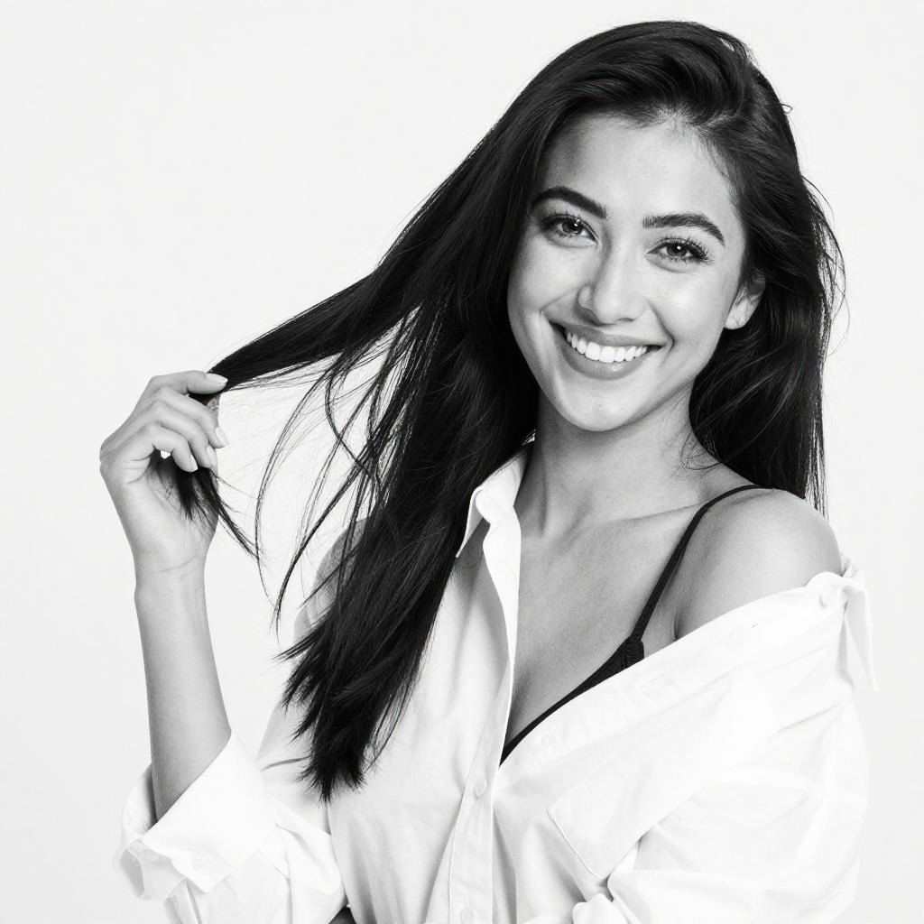 Black-and-white photograph of a smiling woman with long, straight dark hair. She's wearing an unbuttoned white shirt that slips off her shoulders, revealing a black strap of a bra. She's playfully holding a strand of her hair with her right hand. The background is completely white, making her the focal point. Her expression is cheerful and relaxed.