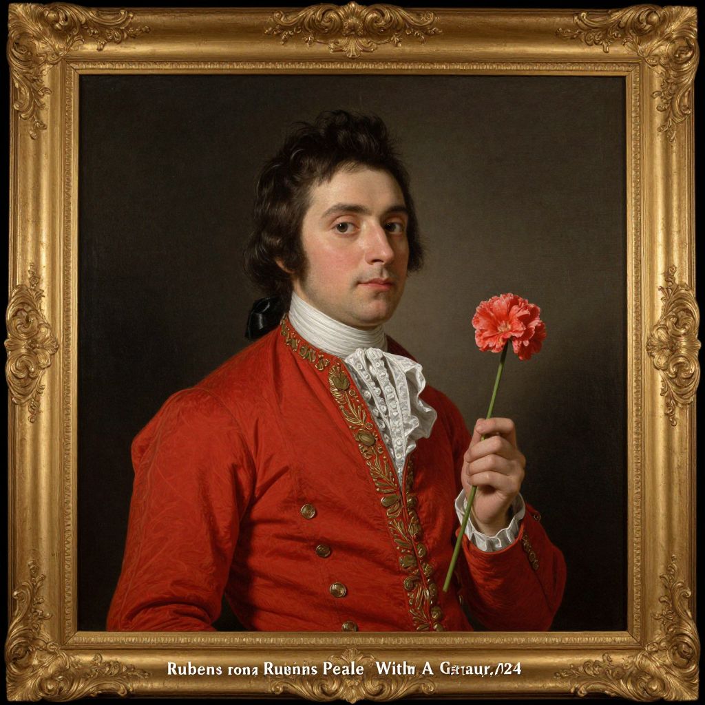 A classical oil painting by Rembrandt Peale, titled \"Rubens Peale With A Geranium,\" showcases a portrait of a young man in a richly detailed red jacket, holding a vibrant geranium flower, set against a dark background and framed in ornate gold, exemplifying the high-definition, vintage style of 19th-century portraiture.