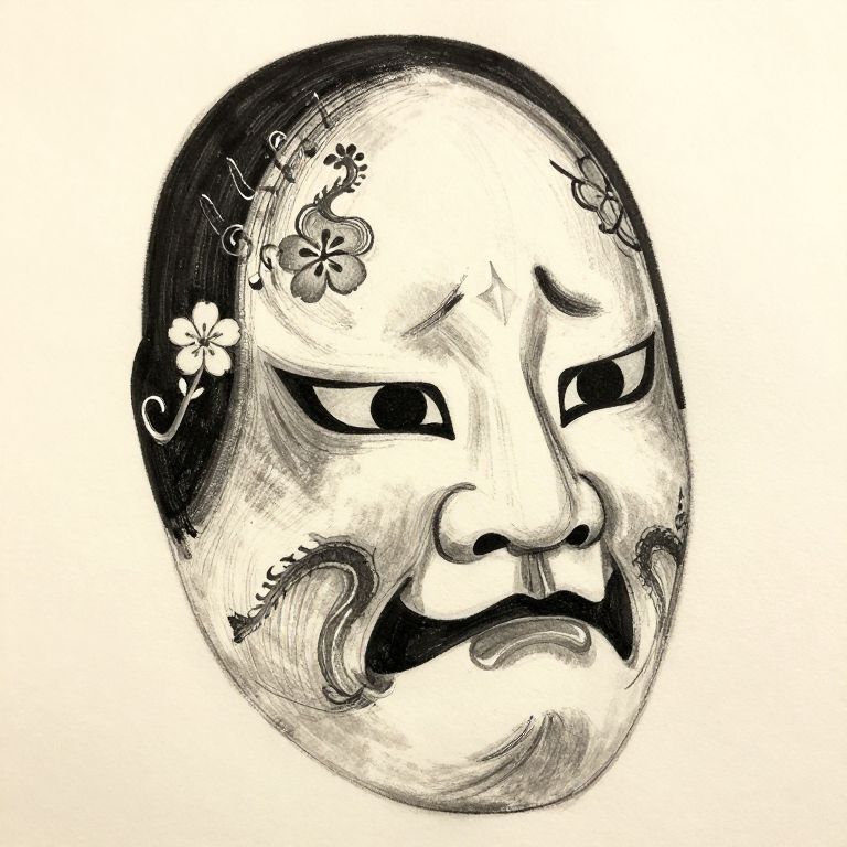 Kabuki mask drawing in monochrome ink style, focusing on dramatic facial contours and symbolic elements like plum blossoms and dragons, layered with textured brush strokes creating depth and intensity, portrayed on aged rice paper effect for an authentic Japanese art feel.