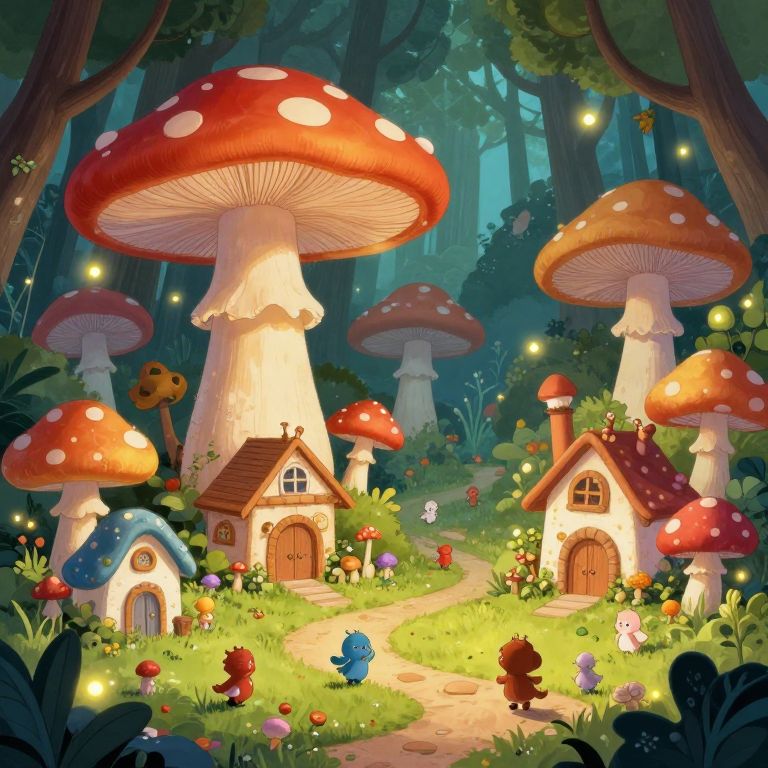 Detailed fantasy illustration of a cute green frog sitting under a large red and white spotted magical mushroom in an enchanted forest. Surrounded by smaller mushrooms, lush green grass, and soft forest lighting.