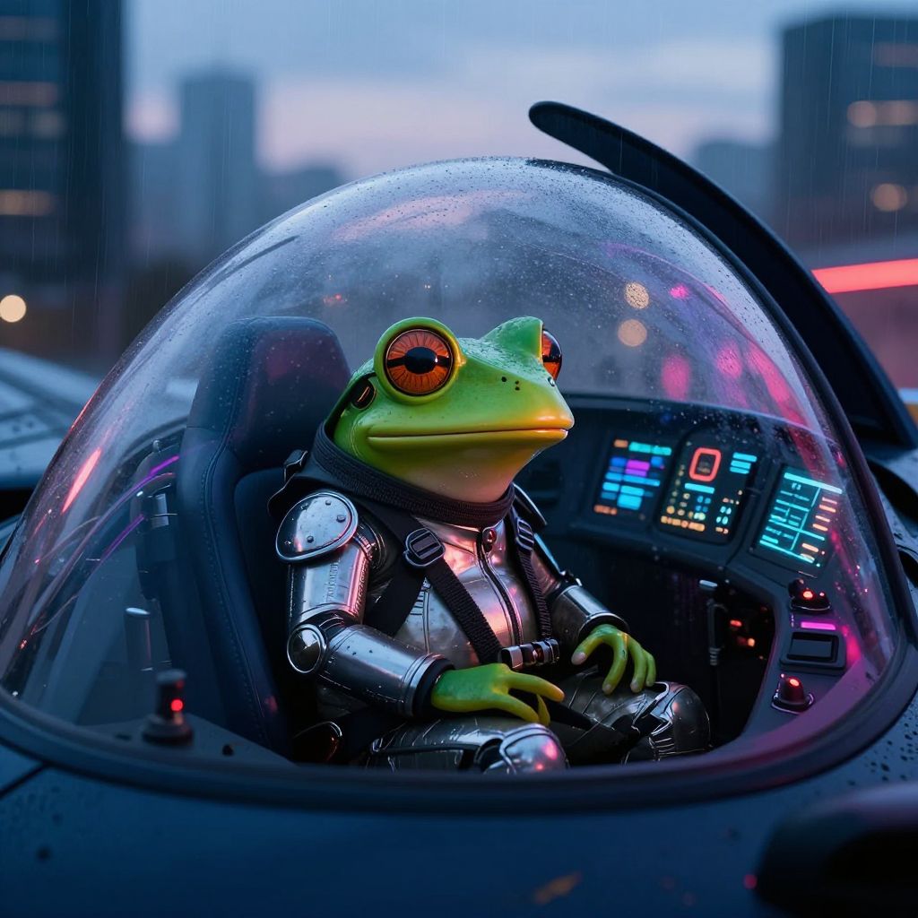 Frog pilot in a futuristic jet cockpit, neon lights reflecting off the glass, sleek metallic suit with high-tech controls, rainy cityscape background at dusk