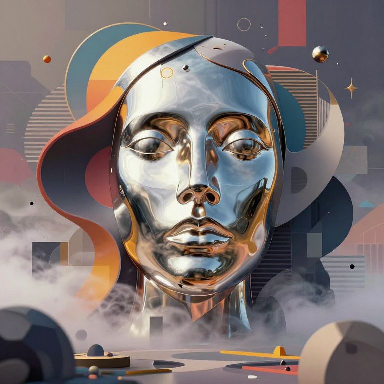 Weird Dalle inspired landscape with abstract shapes merging into a giant face made of liquid metal, surrounded by swirling mist and fragmented geometrical patterns, vivid color palette, futuristic surrealism, visually striking composition.