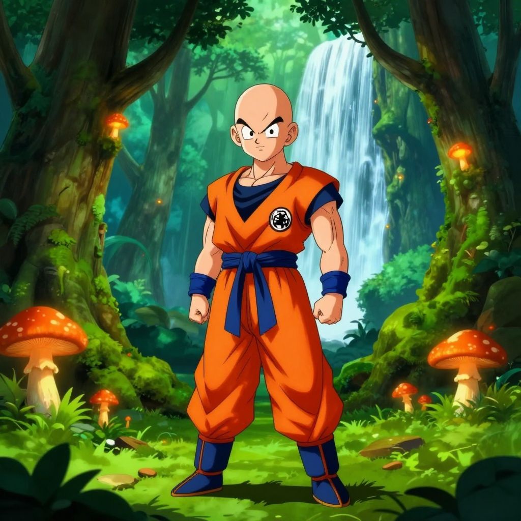 Digital art of bald, muscular Goku in orange martial arts outfit, standing confidently in lush forest with mushrooms and waterfall.