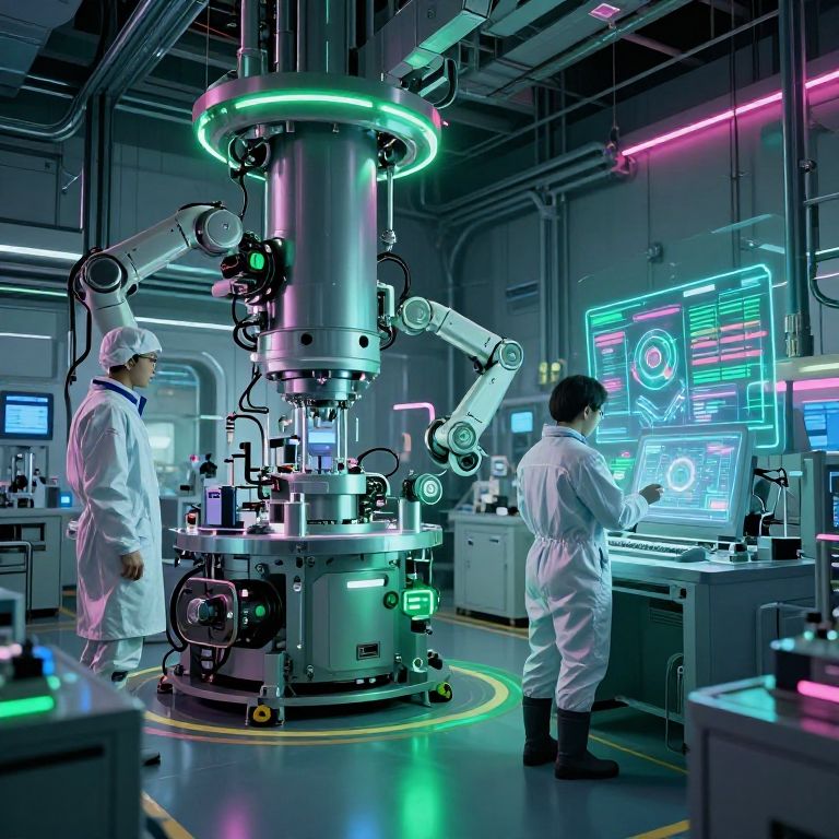 Cnmedianegas imagined as a high-tech underground laboratory, filled with advanced machinery, robots, and holographic interfaces, scientists wearing sleek futuristic suits, ambient neon lighting in shades of green and magenta, evoking innovation and cutting-edge research.