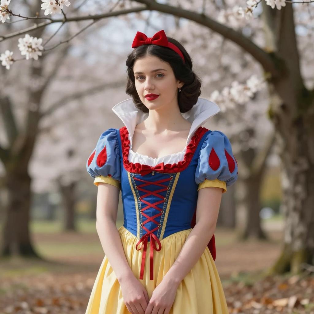 Apple tree fancy dress, photograph of a young woman, standing in an apple orchard, wearing a green dress with red and yellow apple patterns, puffy sleeves, red trim, wearing a crown of red apples on her head, long wavy brown hair, green eyes, natural light, soft focus background with apple trees and apples, summer, realistic, detailed, fantasy-inspired, fairy tale aesthetic, attractive, serene expression