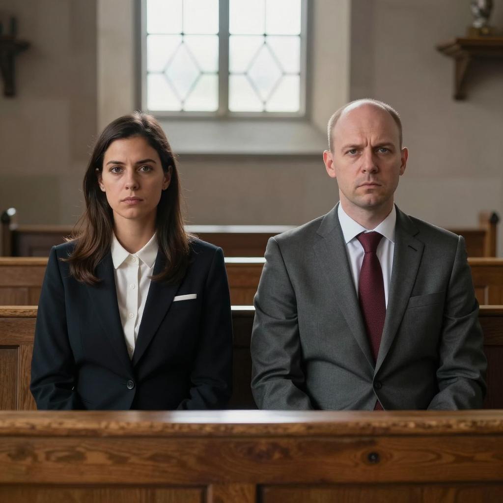 A man and woman seated in a wooden church pew. The woman has dark brown hair, light skin, and wears a black blazer with a white collar and pocket square. The man has balding light brown hair, light skin, and wears a gray suit with a white shirt and maroon tie. Both have serious expressions. Background includes a large, geometric window. The woman is on the left, the man is on the right. Wooden pew and stone wall are in the background.