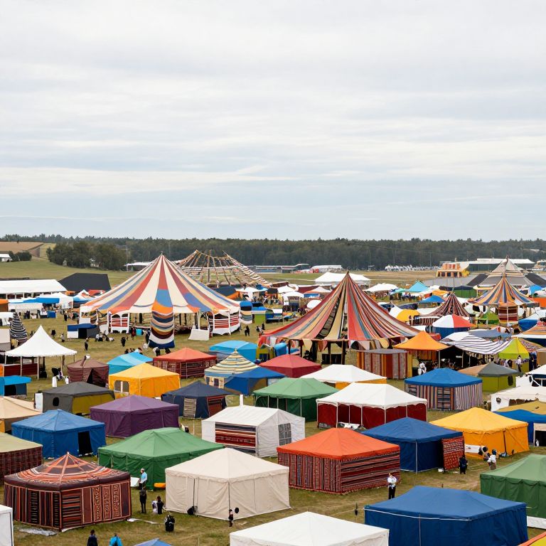 Simple Forms wide angle photorealistic otherworldly sea of colorful tents and tapestries and people at a festival,