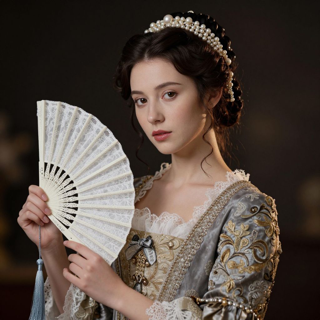 Photograph of an Asian woman with fair skin, wearing an ornate, silver-gray traditional dress, holding a delicate white lace fan, with a pearl