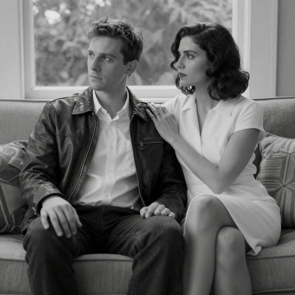 Black-and-white photograph of a man and woman in a close, intimate pose. The man, in a dark suit and tie, gazes intently at the woman, who has shoulder-length hair and wears a checkered shirt. She leans towards him, eyes closed, with her hand on his chest. The background is blurred, focusing attention on their faces and expressions.