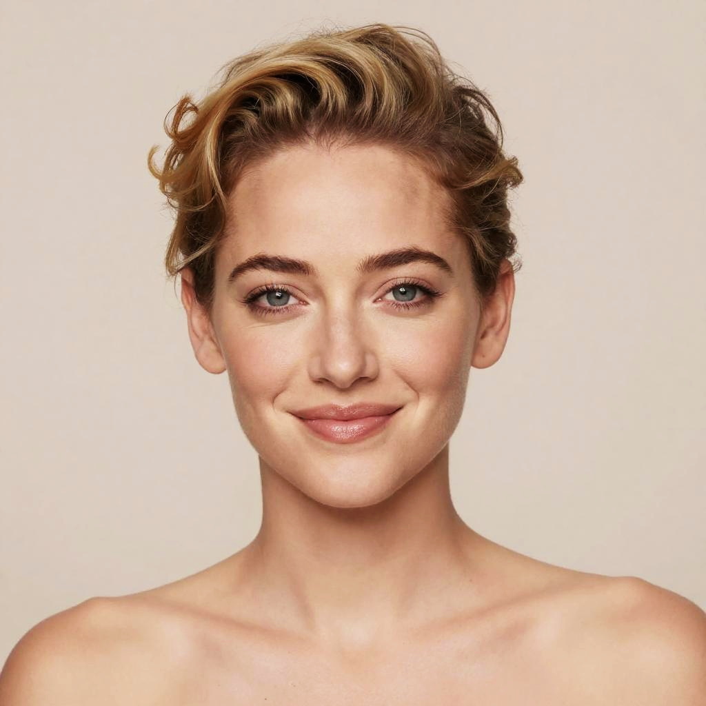 Young Sharon Stone smiling softly, natural beauty with minimal makeup, soft pastel background, gentle lighting emphasizing youthful features, elegant and timeless portrait style