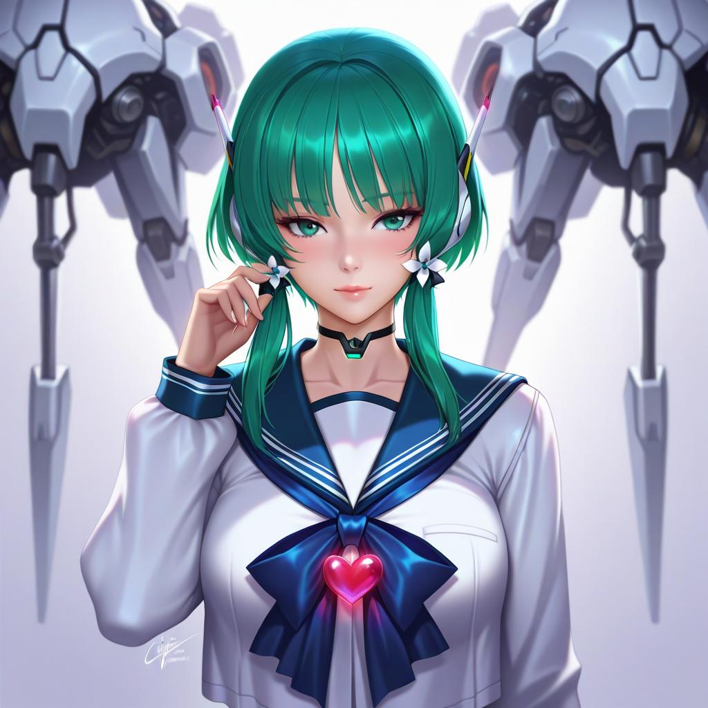 Multi (to heart), to heart (series), 1girl, robot ears, green eyes, short hair, green hair, serafuku, serafuku, long sleeves, android, by artist citemer, illustrious