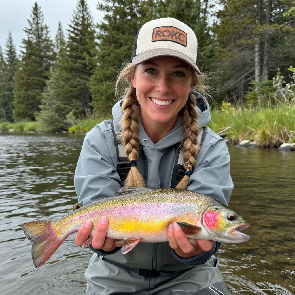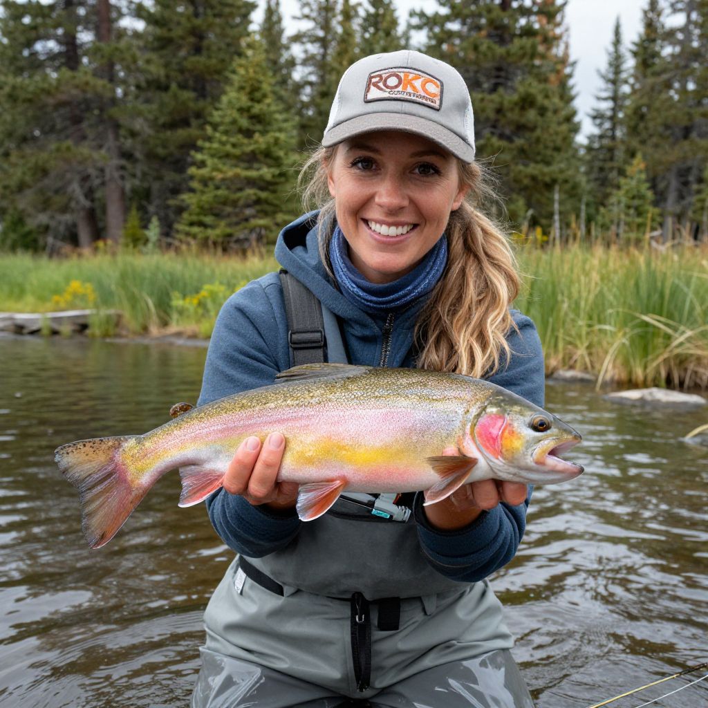 Smiling woman fly fishing, proudly holding a vibrant rainbow trout with striking pink and yellow hues, while wearing a RokC Outfitters cap and waders, set against a serene lakeside backdrop with evergreen trees.