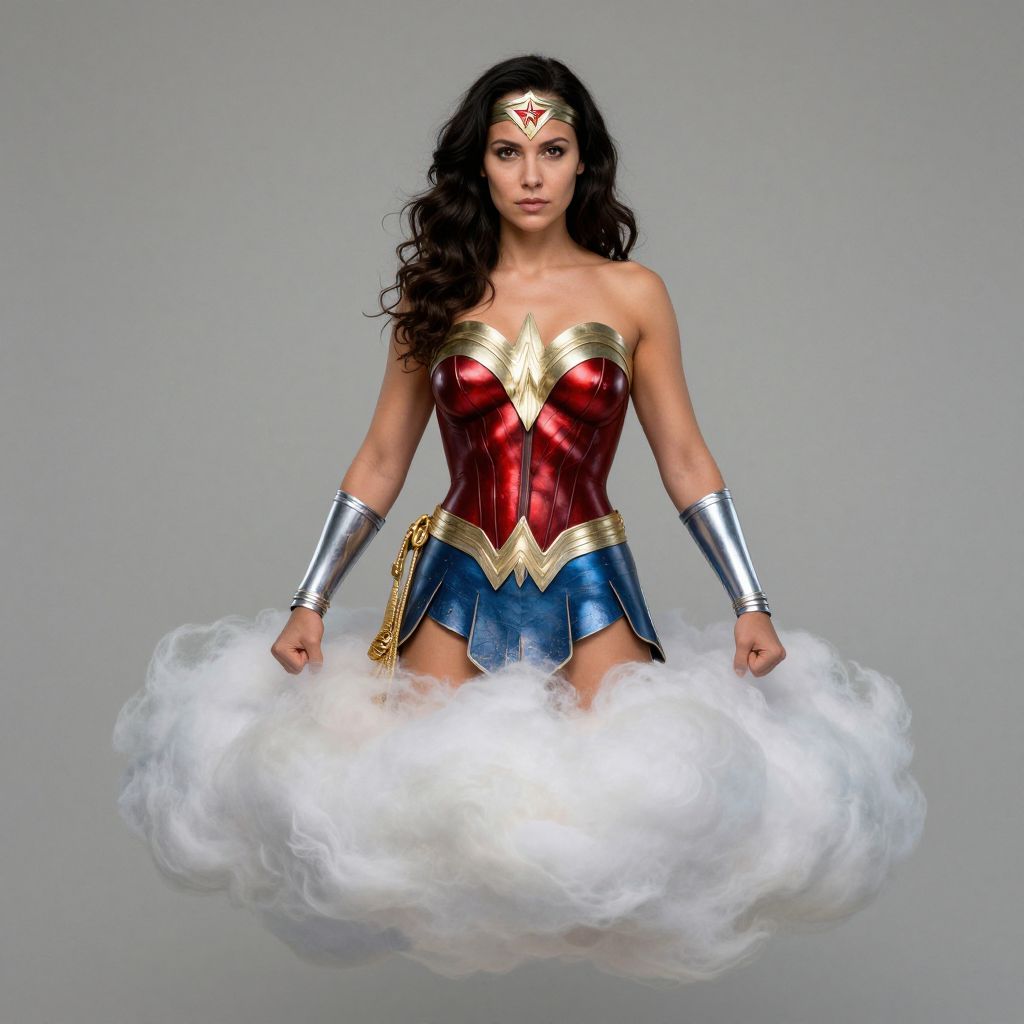 Photograph of Wonder Woman with long black hair, red and gold corset, blue skirt, silver bracelets, and tiara, floating on white clouds