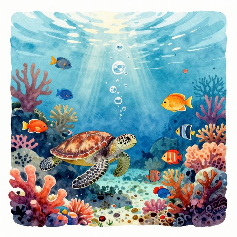 Draw your own picture of an underwater paradise, with colorful coral reefs, diverse marine life like fish and turtles, sun rays piercing the water surface, and bubbles floating upwards, rendered in a detailed and vibrant watercolor effect.