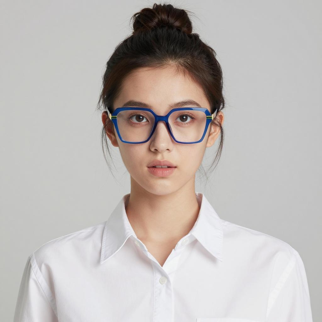 Photograph of a young woman with light skin, pink lipstick, and pink eyeglasses. She wears a pink wide-brimmed hat and an off-the-shoulder pink satin dress. Her hair is pulled back, and she has pearl earrings. Pink background. She gazes directly at the camera with a neutral expression.
