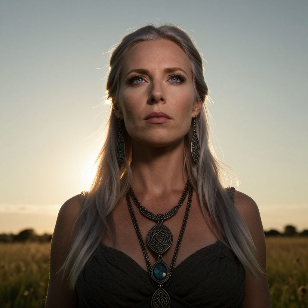 A photorealistic portrait photograph captures a European woman with piercing icy blue eyes and silver-streaked blonde hair adorned in intricate Celtic jewelry. She stands tall amidst a tranquil meadow at dusk, her silhouette bathed in warm golden light from behind, casting elongated shadows that accentuate the angular lines of her face. This unconventional 'worm's-eye view' perspective emphasizes the raw beauty and strength of her rugged features while subtly evoking a sense of awe and reverence for this majestic figure. The image seamlessly blends naturalism with an almost mythical aura, capturing ancient wisdom and timeless grace in one unforgettable portrait that transcends reality.