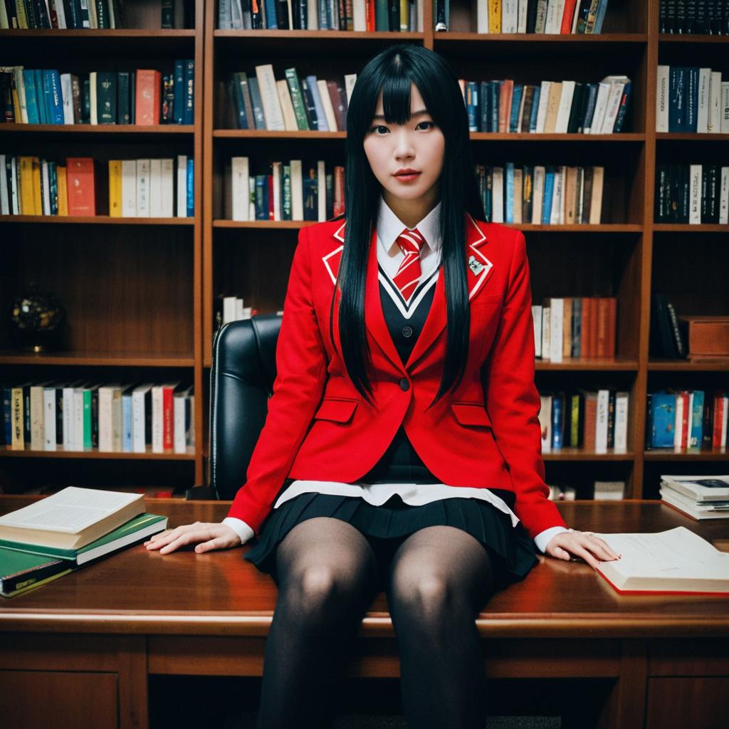 Kakegurui Cosplay, woman in red suit sitting at a desk in front of a bookcase