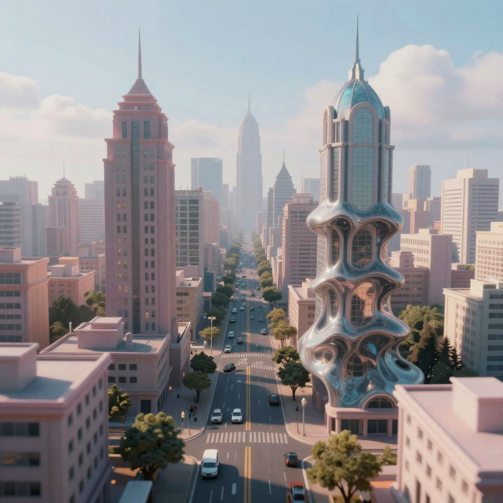 Prompts for stable diffusion portraying a surreal cityscape where buildings and streets dissolve and reassemble fluidly, highlighting motion and transformation, dynamic blending of shapes and textures illuminated with soft pastel and electric hues, dreamlike and abstract style