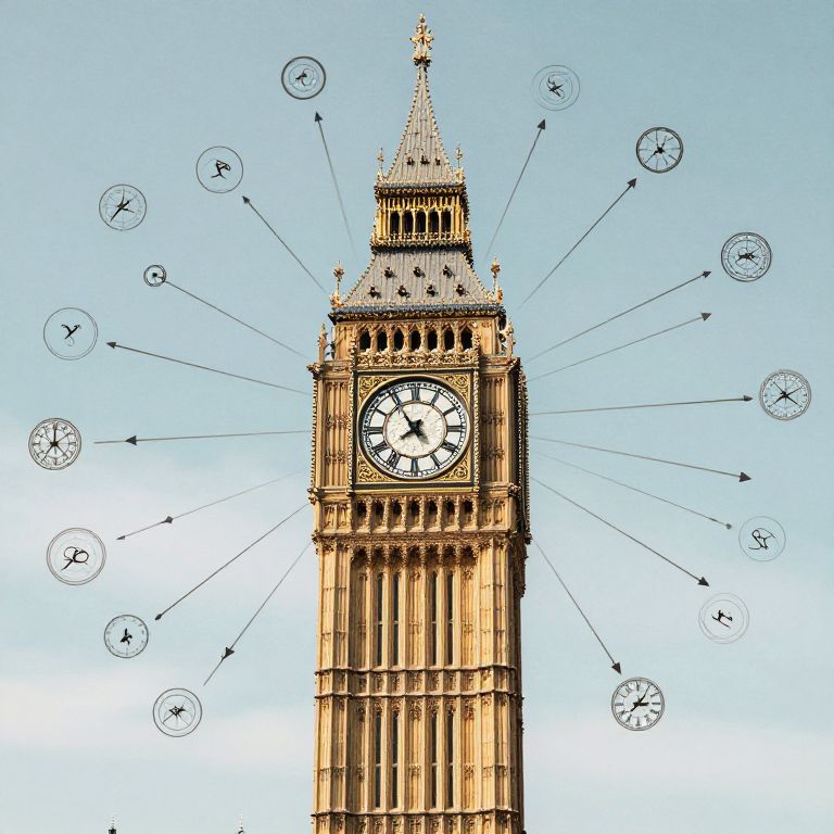 Photograph of London's iconic Big Ben clock tower against a clear blue sky. Superimposed on the image are twelve clock faces, each showing a different time, connected by black arrows radiating outward from the clock tower. Big Ben's ornate golden structure, with its detailed Gothic architecture and large clock face, dominates the center. The clock faces vary in time, adding a dynamic element to the static tower. The image blends realism with abstract elements, creating a visually intriguing contrast.