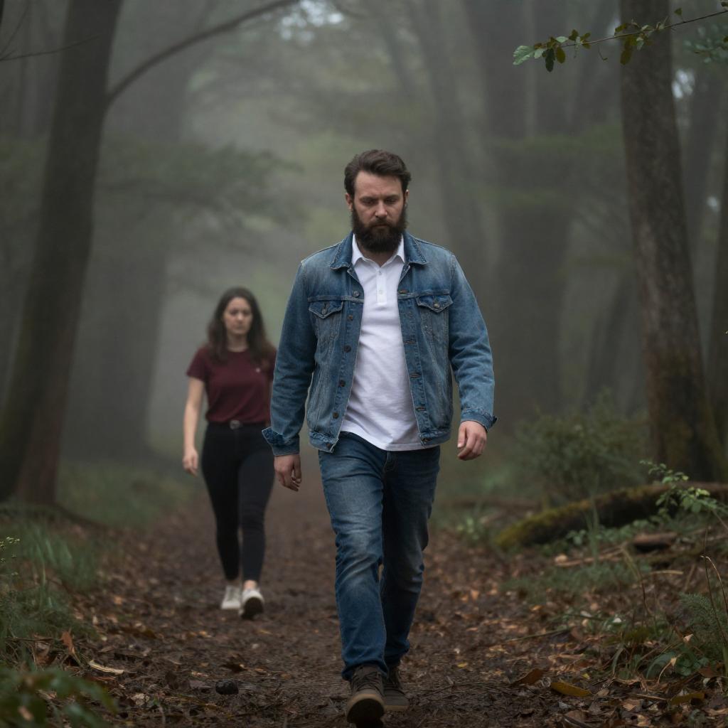 Photograph of a misty forest. A bearded man with dark hair, wearing a blue denim jacket over a white shirt and jeans, walks forward. In the background, a woman with long hair in a red shirt and dark pants follows. Dense trees and fog create a mysterious atmosphere.