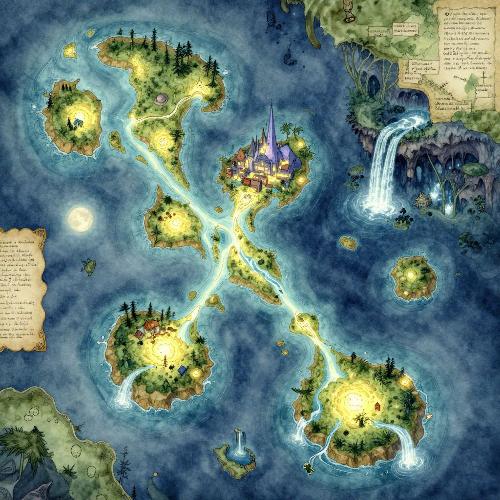 A rich fantasy map water composition illustrating a vast archipelago of glowing islands, interconnected by radiant rivers and mystical waterfalls, with coastal cities gleaming under moonlight, mysterious underwater caves, and legends marked in ancient script, painted with watercolor textures and fantasy cartography details.