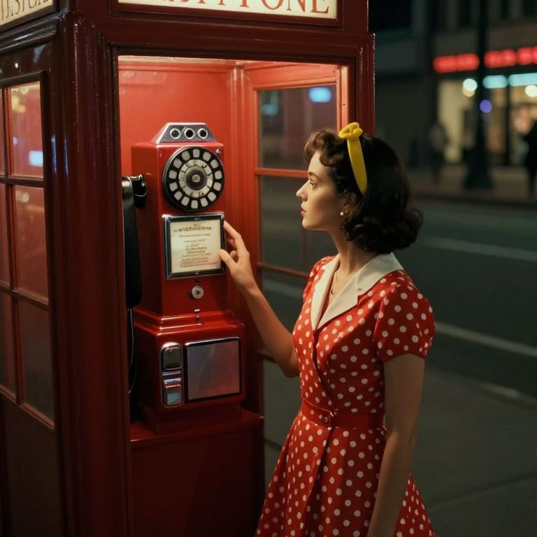 A captivating visual tale reminiscent of Edward Hopper's night-time scenes portrays an isolated individual adorned in a vivid 1950s ensemble with a polka-dotted dress and coordinating accessories, standing beside an antique telephone booth bathed in the soft luminescence of neon lights. The scene is viewed from above, offering viewers a glimpse into her contemplative stare as she extends her hand towards the radiating phone, alluding to a blend of yearning and reminiscence. This evocative arrangement is suffused with warm, diffused light that casts gentle silhouettes across the urban backdrop, crafting an ambiance brimming with emotional profundity and conveying solitude amidst vibrant city life.