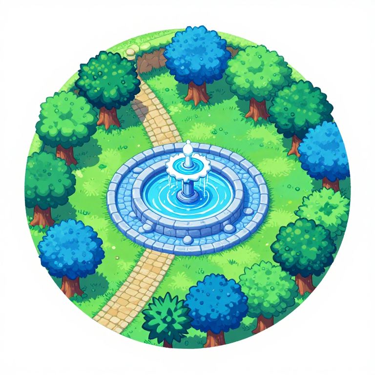 The image depicts a vibrant, 8-bit style Pokémon game level set in Delfs Blue colors. The circular design is the focal point, with a white background that contrasts sharply with the vivid greens and blues of the landscape. At the center, a large, circular fountain with a blue water feature is surrounded by a patterned stone walkway. The fountain is encircled by a lush, green garden with various trees and bushes, creating a serene and inviting atmosphere. A winding path leads from the bottom left corner of the image, weaving through the garden and eventually leading to the fountain. The overall composition is balanced, with the fountain and garden positioned centrally, while the path and surrounding trees create a sense of depth and perspective. The image is rich in detail, with textures that suggest a mix of natural and man-made elements, such as the smooth stone walkway and the rough bark of the trees. The use of Delfs Blue colors gives the scene a nostalgic, retro feel, reminiscent of classic Pokémon games.