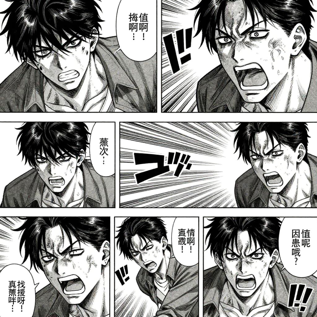 Violent manga panels portraying a dramatic revenge scene with intense close-ups on characters’ faces showing rage and determination, dynamic action sequences with fluid motion strokes, heavy use of cross-hatching and bold contrast to highlight the emotional turmoil and violence.